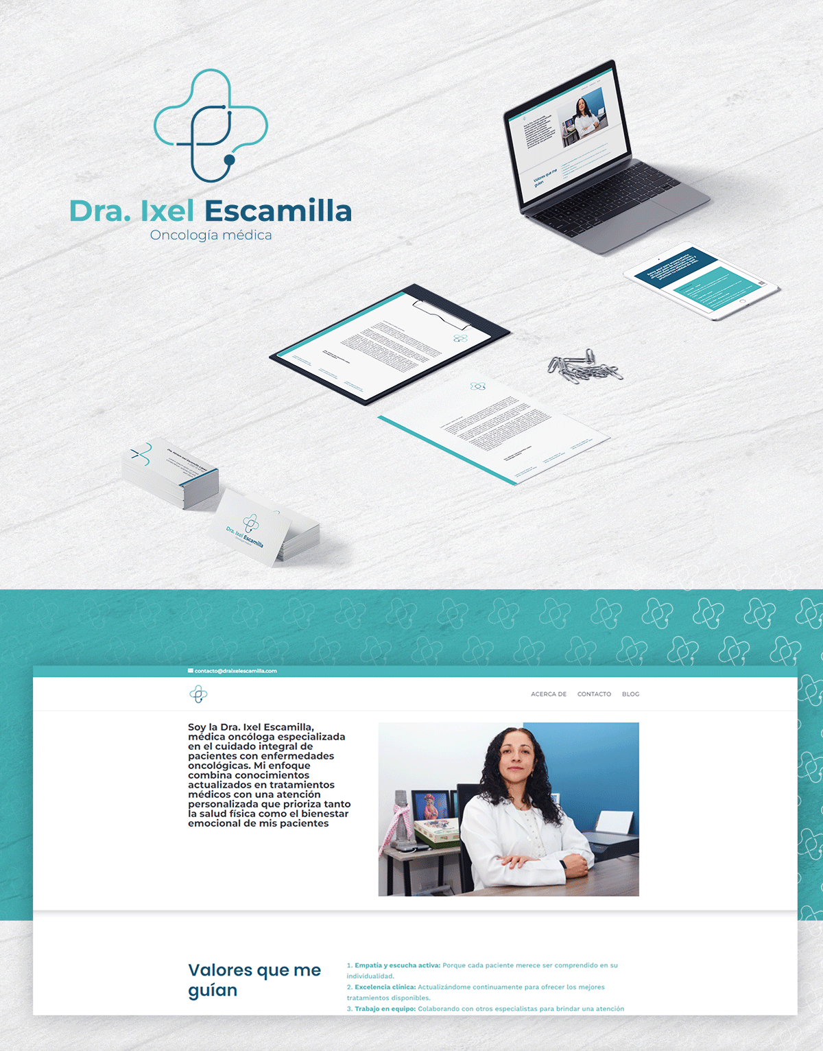 Para la Dra. Ixel Escamilla, especialista en oncología en Puebla, México, desarrollé la identidad gráfica y su estrategia digital. El objetivo central fue transitar de un enfoque comercial hacia una plataforma de autoridad médica e informativa, priorizando la divulgación de contenido de valor sobre tratamientos oncológicos